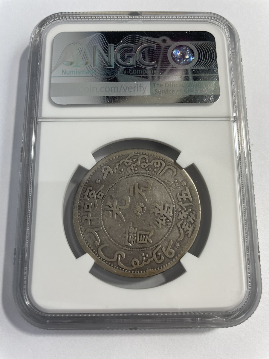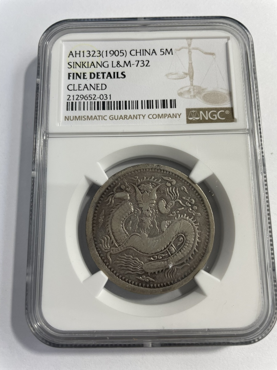 China. Imperial. Xinjiang Province (Sinkiang). 5 Miscals, Kashgar AH 1323 (1905). Large dragon, tail points left; Inverted Turki legend, Date lower right written "1/32/3". Y.21.6, L&M 732. NGC XF Details, cleaned.