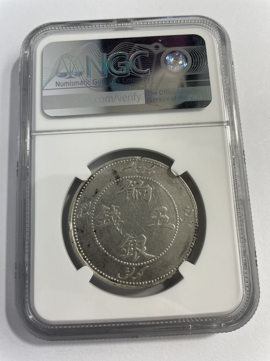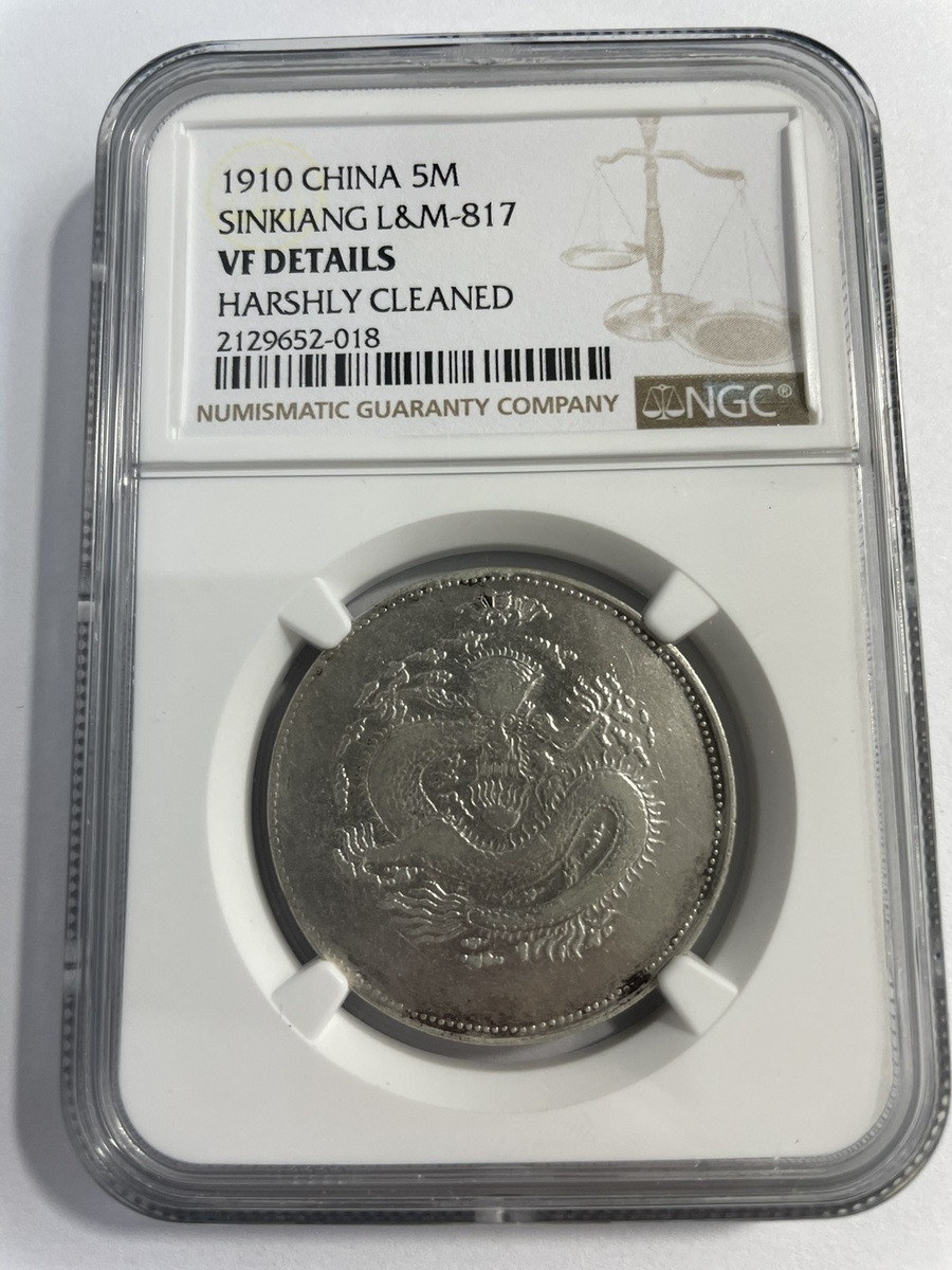 China. Imperial. Xinjiang Province (Sinkiang). 5 Miscals, Kashgar AH 1323 (1905). Large dragon, tail points left; Inverted Turki legend, Date lower right written "23/13". Y.21.6, L&M 732. NGC Fine Details, cleaned. Now toning.