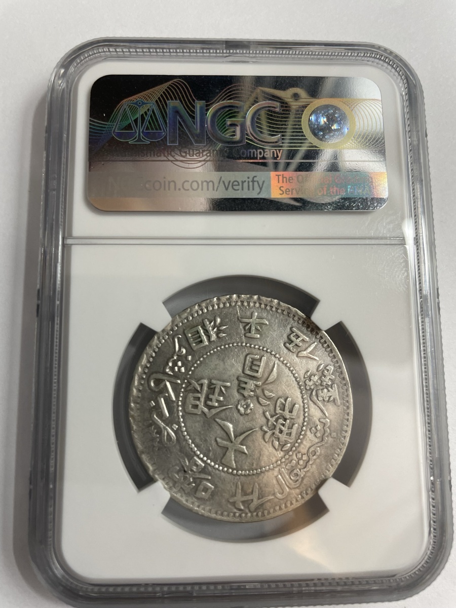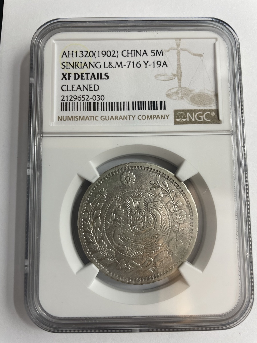 China. Imperial. Xinjiang Province (Sinkiang). 5 Miscals, Kashgar AH 1325 (1907). Dragon within beaded circle, wreath around; date upper right. Y.25.3. NGC XF Details, cleaned (wrong date and reference number on label).