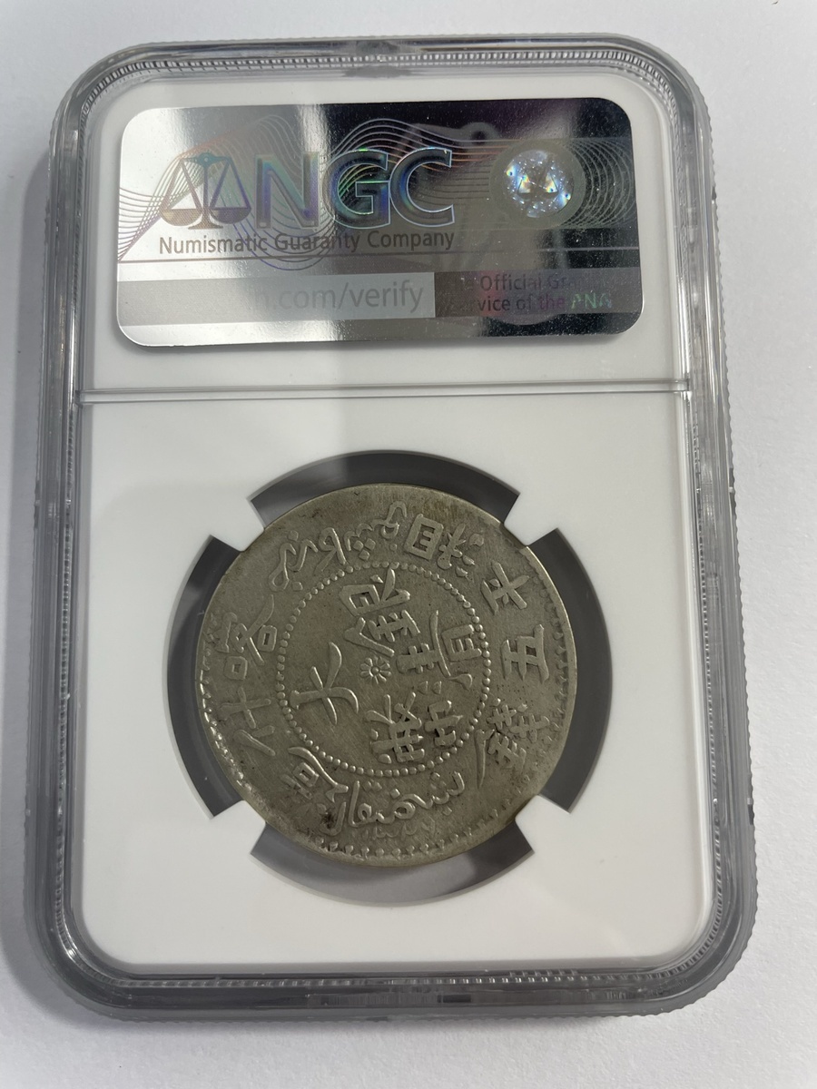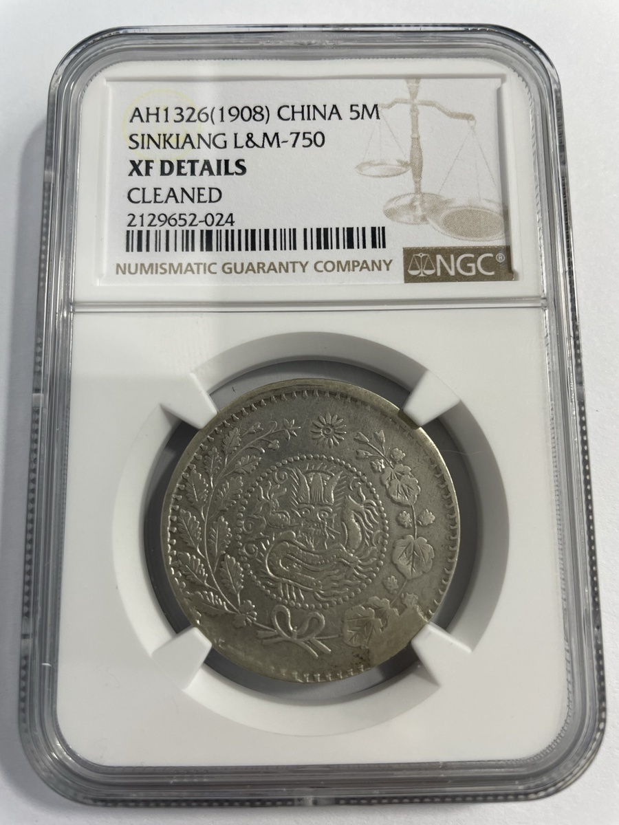 China. Imperial. Xinjiang Province (Sinkiang). 5 Miscals, Kashgar AH 1326 (1908). Dragon within beaded circle, wreath around; date upper left. Y.25.1, L&M 750. NGC XF Details, cleaned.