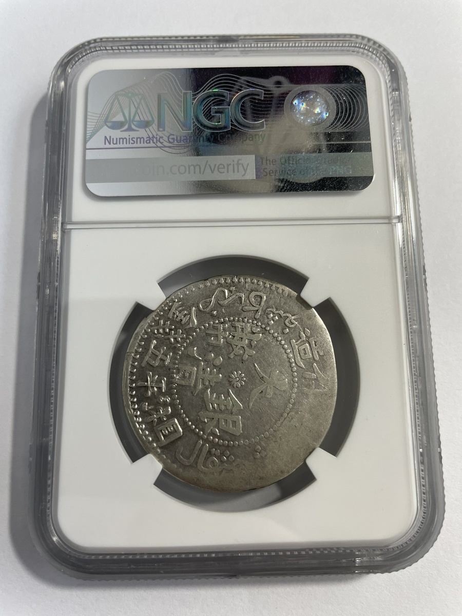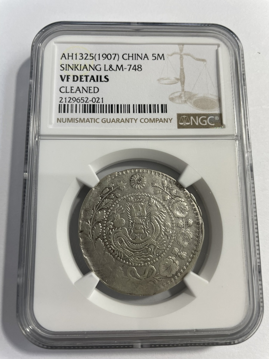 China. Imperial. Xinjiang Province (Sinkiang). 5 Miscals, Kashgar AH 1326 (1908). Dragon within beaded circle, wreath around; date upper left. Y.25.1, L&M 750. NGC VF Details, cleaned. Now toning.