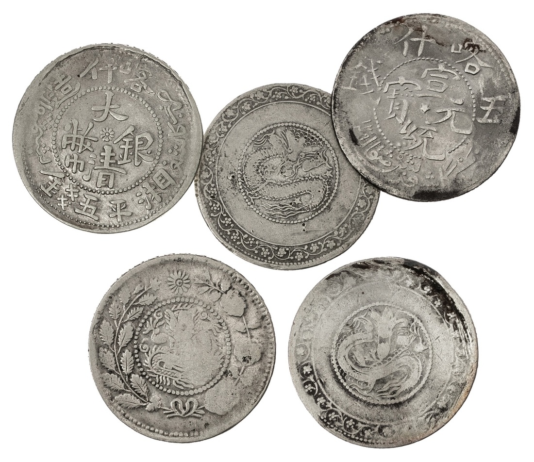 China. Imperial. Xinjiang Province (Sinkiang). Quintet of 5 Miscals, Kashgar. ND (2). Dragon within beaded circle, outer wreath. Y.25. Weak centers, dragon side. Fine, VF; AH 1327. Dragon within beaded circle, floral outer border. Y.27. Stain and a number of small digs. VF Details; AH 1329 (2). Star in center. Y.A28. Both with stains, latter some porosity. Fine-VF. (5)