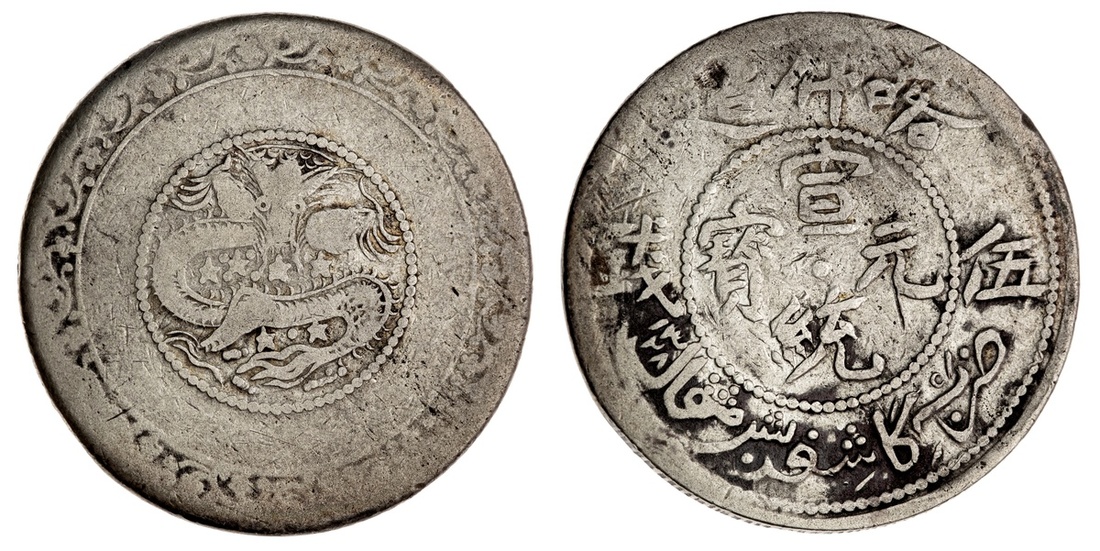 China. Imperial. Xinjiang Province (Sinkiang). 5 Miscals, Kashgar AH 1328 (1910). Dragon with six stars within beaded circle, ornate outer border; da qing yin bi, dot at center, "Kashgar" at top, official "wu" at right, Turki legend with date below. Y.27.1. Weakly struck dragon side Some staining in periphery. F-VF.