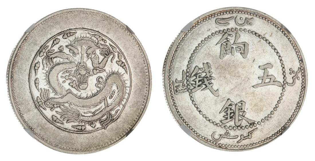 China. Imperial. Xinjiang Province (Sinkiang). 5 Miscals, nd (1910). Dragon within inner circle. L&M 819, Y.6.1. NGC VF 35.