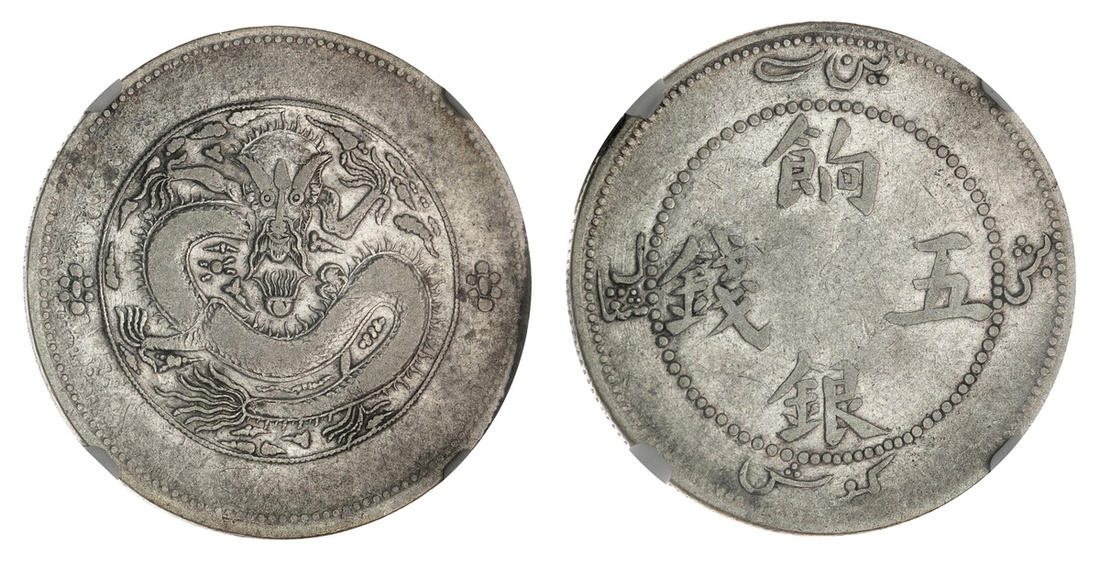 China. Imperial. Xinjiang Province (Sinkiang). 5 Miscals, nd (1910). Dragon within inner circle, rosettes, formed of six pellets with large lozenge at center, at sides; Y.6.2. NGC XF Details, cleaned. Now toned a light gray.