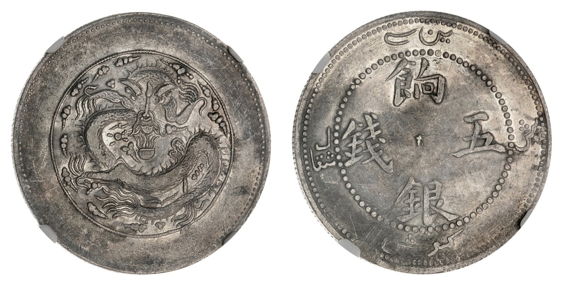 China. Imperial. Xinjiang Province (Sinkiang). 5 Miscals, nd (1910). Dragon within inner circle; dot at center. Y.6.3. NGC XF Details, cleaned. Now toned, steely slate gray.
