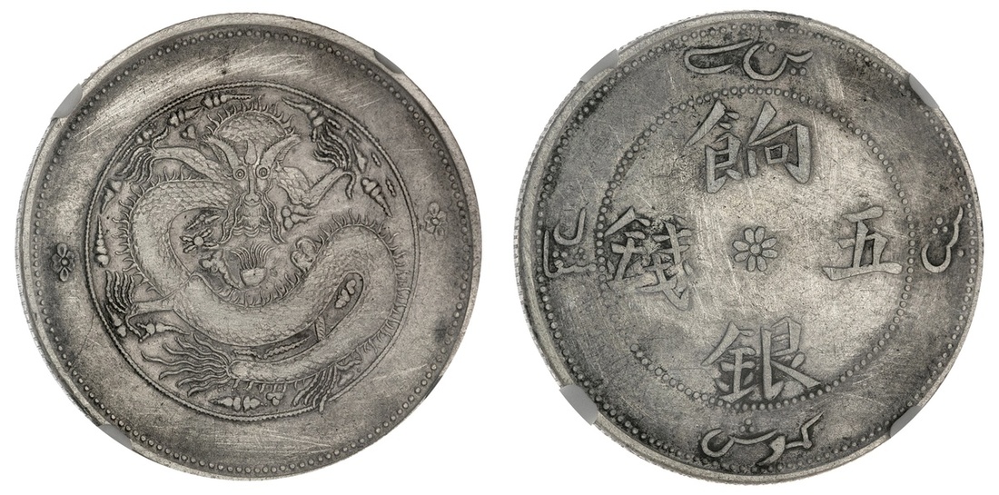 China. Imperial. Xinjiang Province (Sinkiang). 5 Miscals, nd (1910). Dragon within inner circle, floral rosettes at sides; Eight-petalled rosette at center with central dot. L&M 819A, Y.6.6. NGC XF Details, harshly cleaned.