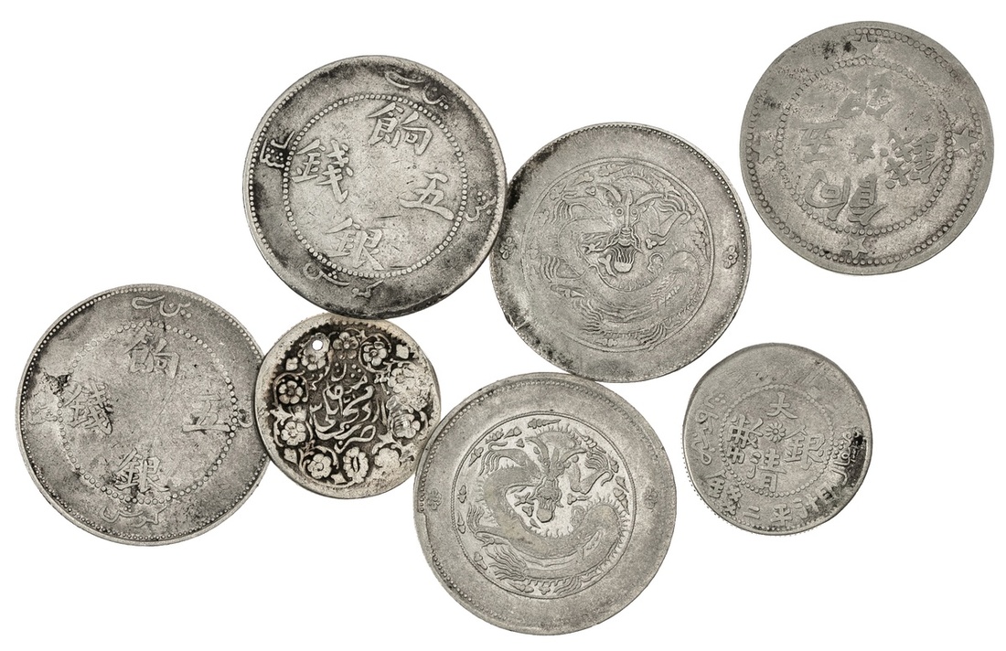China. Imperial. Xinjiang Province (Sinkiang). Lot of 5 Miscals: ND (1910). Uncircled dragon (2), Rosettes at side of dragon, eight-petalled rosette at center (2). Y.6, 6.6. One Fine, others About VF-VF; AH 13xx. Star at centers, beside dragon, four stars reverse. Y.31. Large test X scratch, weakness in peripheries. About VF details; also 2 Miscals, Kashgar, AH 1326. Y.23. Dragon barely struck up, stain. VG/VF; and a holed 2 Miscals, Ürümchi AH 1321. (7)