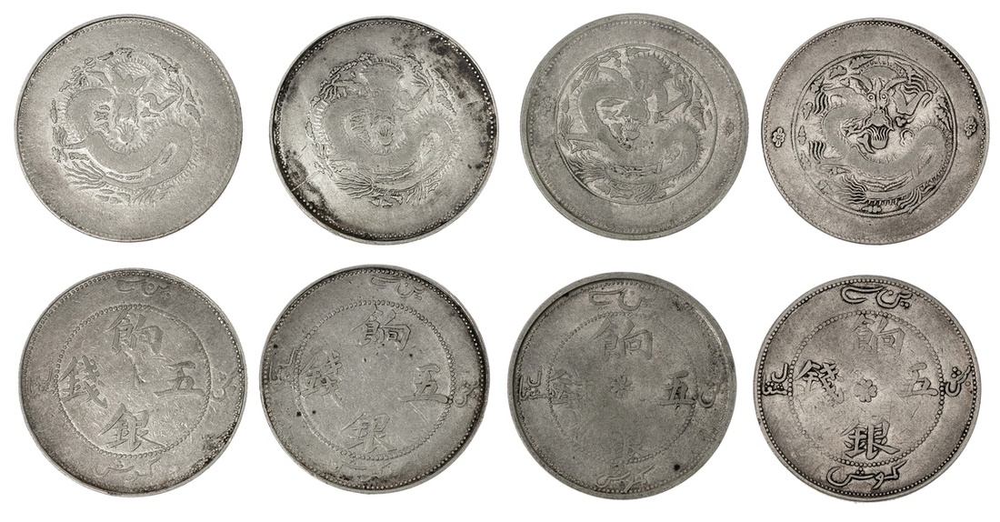 China. Imperial. Xinjiang Province (Sinkiang). Lot of 5 Miscals. ND (1910). Uncircled dragon (2), Rosettes at side of dragon, eight-petalled rosette at center (2). Y.6, 6.6. Fine-VF. (4)