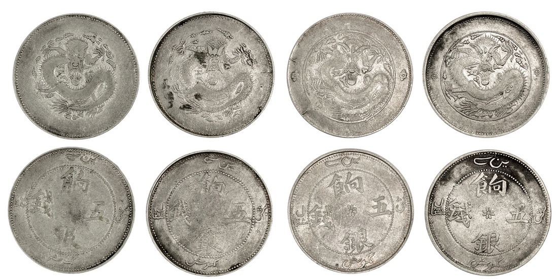 China. Imperial. Xinjiang Province (Sinkiang). Lot of 5 Miscals. ND (1910). Uncircled dragon (2), Rosettes at side of dragon, eight-petalled rosette at center (2). Y.6, 6.6. Two with light stain, some weakness. About VF-Very Fine. (4)
