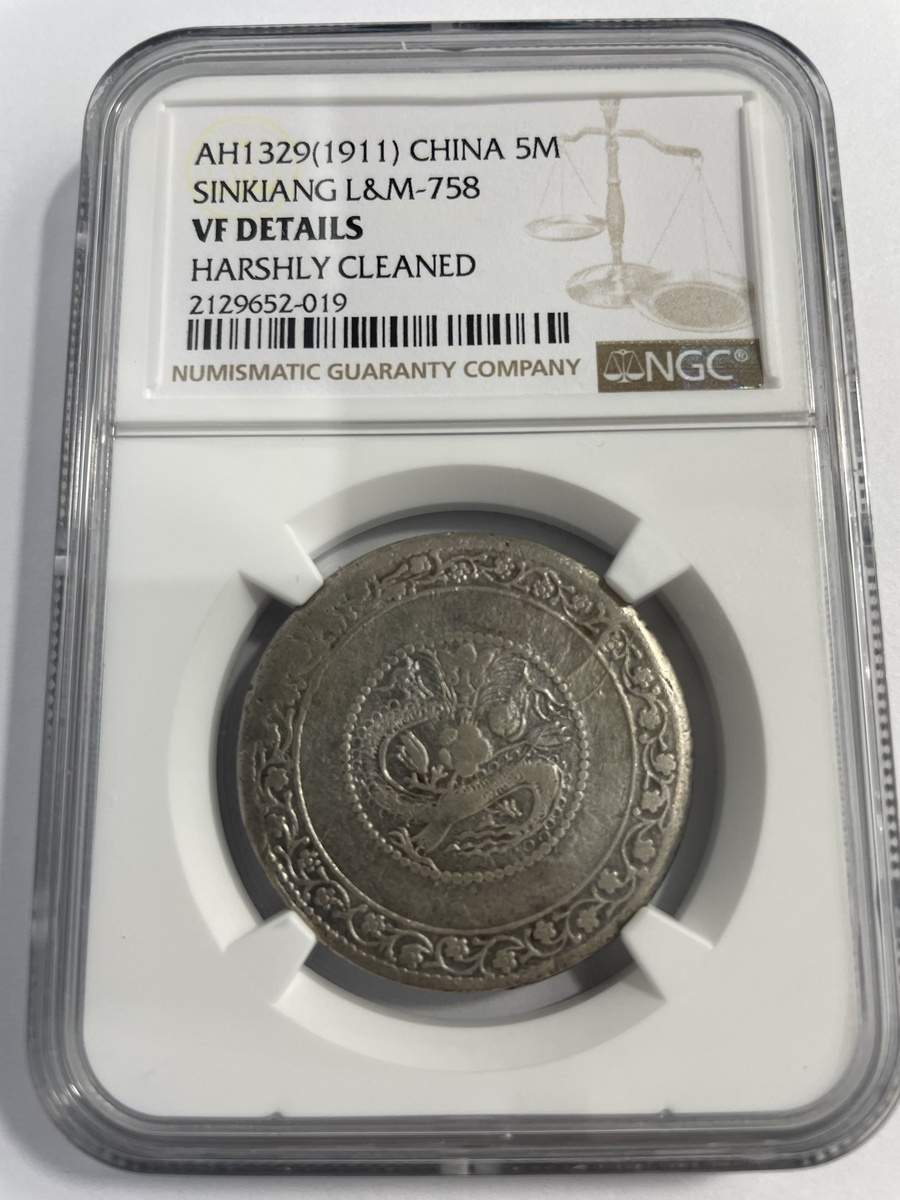 China. Imperial. Xinjiang Province (Sinkiang). 5 Miscals, Kashgar AH 1329 (1911). Dragon within beaded circle, outer ornate border; Rosette at center. L&M 758. NGC VF Details, harshly cleaned.