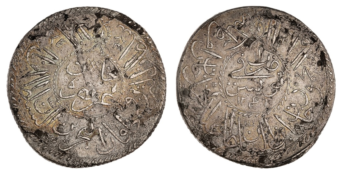 Tunisia. Ottoman. Sultan Mahmud II (AH 1223-1255/ 1808-1839 AD). 2 Kurush (Piastre), Tunis AH 1246. `azz nasrahu khan legend in central cartouche, rev. Mint and date within central cartouche. KM 93, unlisted date in J.S. and Olcer. Some small deposits and light porosity. Toned. About Extremely Fine