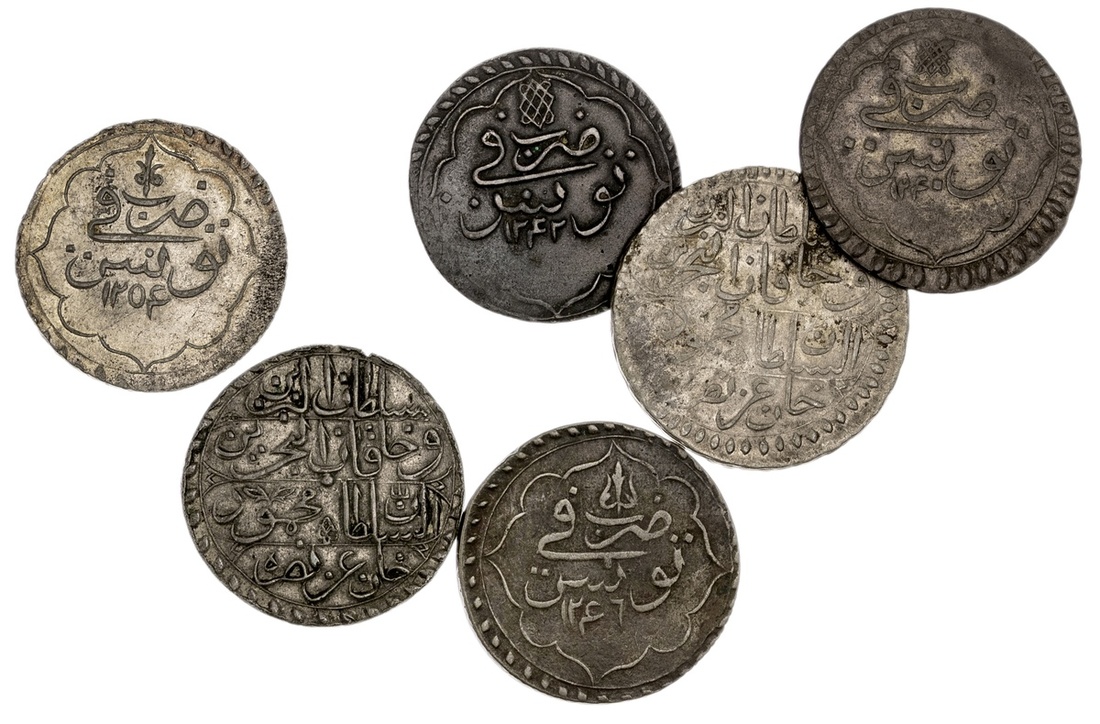 Tunisia. Ottoman. Sultan Mahmud II (AH 1223-1255/ 1808-1839 AD). Kurush (Piastres) Tunis AH 1228, 1240, 1242, 1246, 1247 and 1254. KM 82, 90. Nice examples. VF-About Extremely Fine. (6)