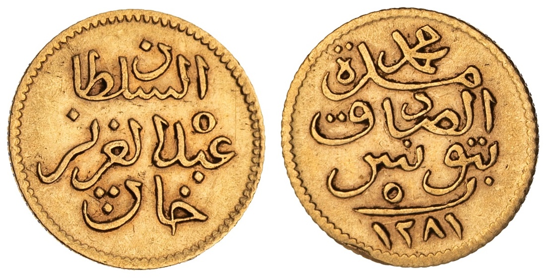 Tunisia. Sultan `Abd al-`Aziz with Muhammad Sadiq Bey (AH 1276-1293/ 1860-1876 AD). Gold 5 Piastres, AH 1281. Sultan's legend; Bey's legend. KM 162. About Extremely Fine.