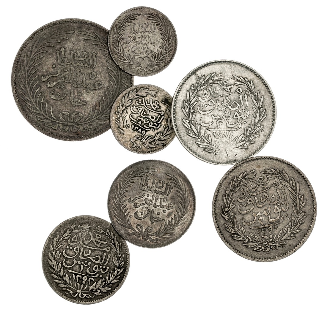 Tunisia. Ottoman. Sultan `Abd al-`Aziz with Muhammad al-Sadiq Bey (AH 1276-1293/ 1860-1876 AD). 4 Kurush (4 Piastres) Tunis AH 1290, 2 Kurush (2 Piastres) Tunis AH 1289 (cleaned), 1290; Kurush (Piastre) Tunis AH 1289, 1292; and 8 Kharub Tunis AH 1289 (2, one with adj/file marks at rim). KM 167, 147a, 145a, 160a. The AH 1292 Piastre and the 8 Kharubs Fine, the others VF. (7)