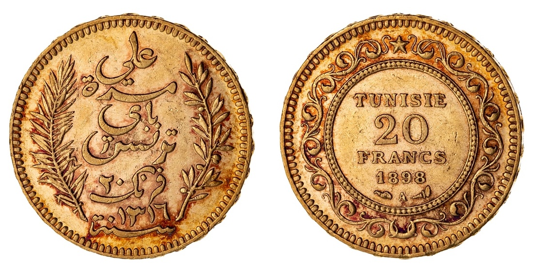 Tunisia. French Protectorate. `Ali Bey (AH 1299-1320/ 1882-1902 AD). 20 Francs, AH 1316- 1898 A. Arabic legend, French legend. KM 227. Toned. AU.