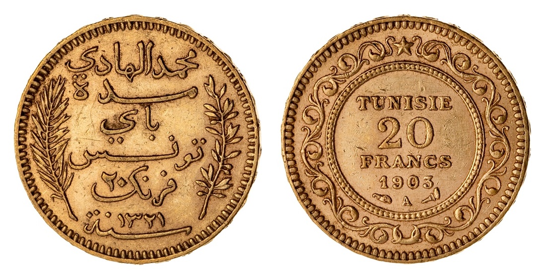 Tunisia. French Protectorate. Muhammad al-Hadi Bey (AH 1320-1324/ 1902-1906). 20 Francs, AH 1321- 1903 A. Arabic legend, French legend. KM 234. Extremely Fine.