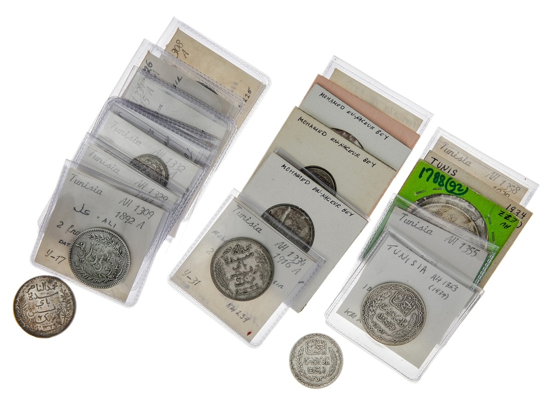 Tunisia. French Protectorate. 50 Centimes, 1891, 1914, 1915, 1916; Francs 1891, 1908, 1911 (2), 1912, 1915 A; 2 Francs, 1891, 1892, 1911 (2), 1916 (2). VF-Uncirculated; Ahmad Pasha Bey. 5 Francs, AH 1353, 1355, 1358; 10 Francs, AH 1353 (cleaned); and 20 Francs, AH 1353 (2). VF-EF. (22)