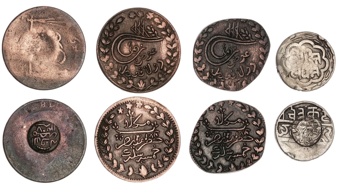 Yemen. Eastern Aden Protectorate. Qu'ati State of Shihr and Mukalla. Awadh b. `Umar, as Hakim (1881-1902). Group: Government of Munasir countermarked issues (considered to be fantasies): ½ Rupee, AH 1307. al-dawla munasir 1307 c/m'd on a Half Rupee of Mewar (Y.10); 1/4 Anna AH 1307, same c/m on a well-worn EIC balance scale ¼ Anna; c/ms Very Fine; and AE 5 Chomsihs, Mukalla AH 1318 (2). Toughra. KM 48. Very Fine. (4)