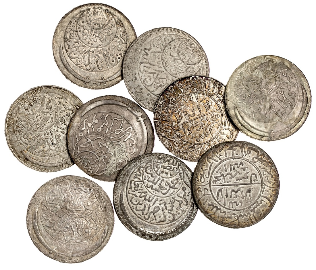 Yemen. Mutawakkilite Kingdom. Imam Yahya-Imam Ahmad. Silver Crowns (9). Imadi Riyal, AH 1344; Ahmadi Riyal, AH 1370, 1371, 1373 (2), 1374, 1375, 1378, 1380. Y.7, 17. EF-AU. (9)