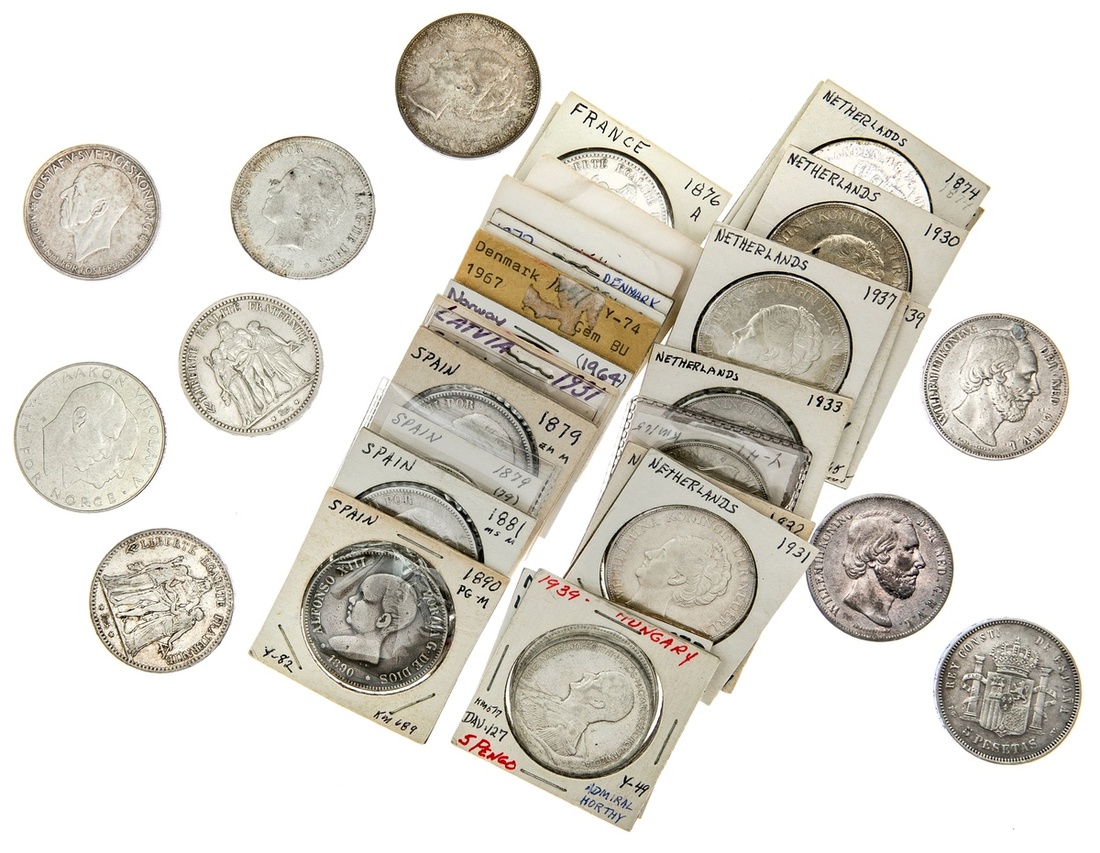 19th-20th Century European Silver Crowns. Bulgaria - 5 Leva, 1894 (2); Denmark - Commemorative 10 Kroner, 1967 (2), 1972; France - 5 Francs 1831 A, 1841 B, 1873, 1875, 1876 A (2); Hungary - 5 Korona 1900 KB, 5 Pengo, 1939; Italy - 5 Lire, 1873 M, 1876 R (2), 1877 R; Latvia - 5 Lati, 1931; Netherlands - 2 ½ Gulden 1851, 1852 (plugged), 1858, 1868 (heavy contact marks), 1874 (2, one heavy contact marks), 1929, 1930 (2), 1931, 1932 (2), 1933, 1937, 1938, 1939, 10 Gulden 1970; Norway - 25 Kroner, 1970, 10 Kroner, 1964; Romania - 500 Lei, 1941; Spain - 5 Pesetas 1879 (2), 1881, 1890, 1892, 1894; and Sweden - Commemorative 5 Kronor 1935. A few once cleaned. Fine-Uncirculated. (45)
