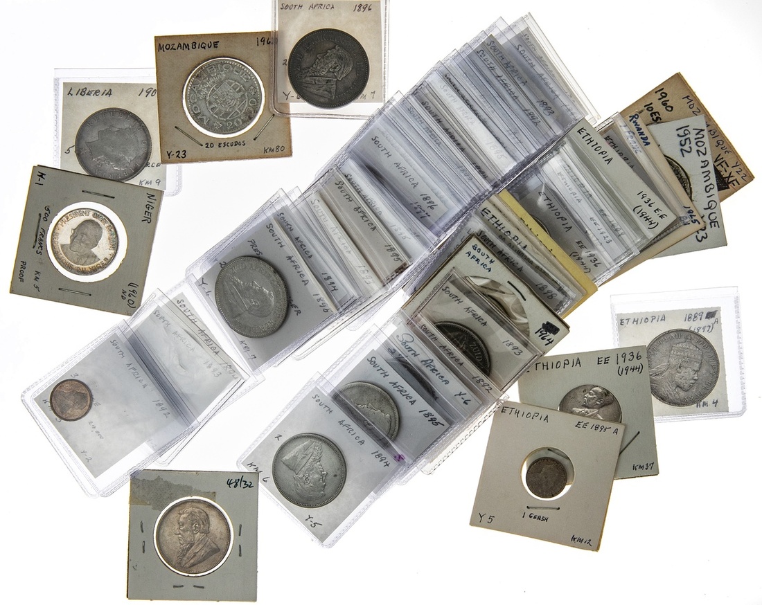 South African Boer issues and other African Minors. Includes: Z.A.R. Threepence, 1892-1897; Sixpence, 1892, 1895-1897; Shillings, 1892-1894, 1895 (2), 1896, 1897; 2 Shillings, 1892-1896; 2 ½ Shillings, 1892-1897; AEs (3); Ethiopia. Menelik II. ½ Birr, ¼ Birr, Ghersh (2); Haile Selassie Silver 50 Cents (7), AEs (3); Niger 500 Francs, 1960 Liberia 50 Cents, 1906; Mozambique silver minors (5), other AEs. Some once wiped or cleaned. Very Good-EF. (56)