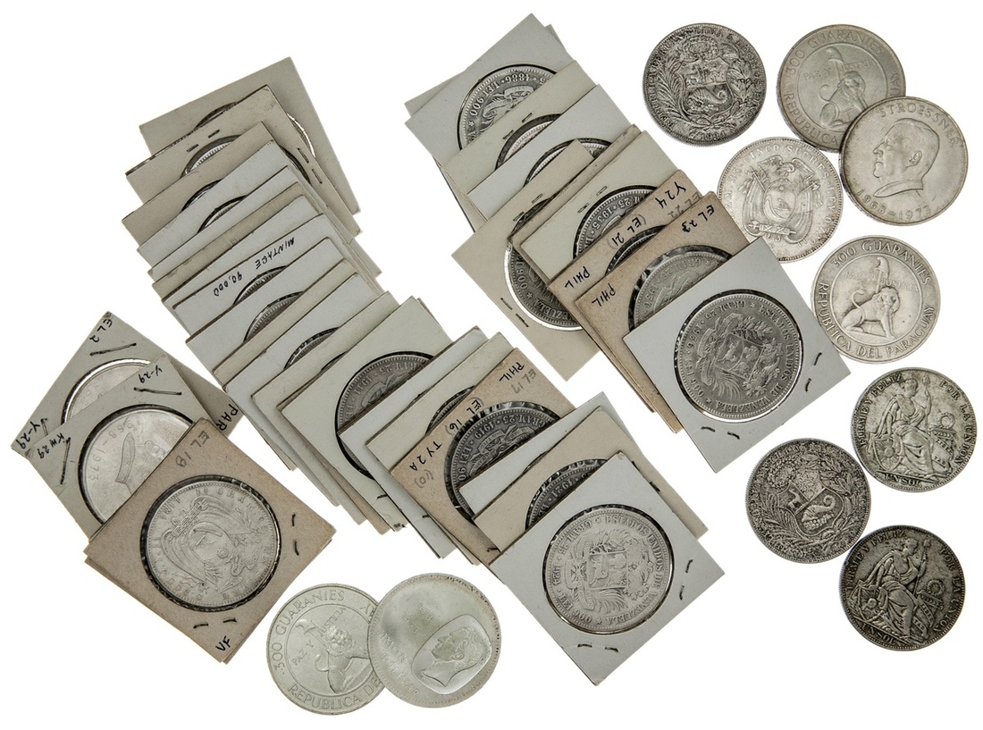 Large Lot of South American Silver Crowns. Includes: Chile. Peso, 1895, 5 Pesos, 1927; Ecuador. Sucres, 1884, 1892 Birmingham, 1897 Lima, cleaned; 5 Sucres, 1943 (3), 1944 (5); Paraguay. 300 Guaranies, 1968 (6); Peru. Sols, 1930 (4), 1931, 1933, 1934 (6), 1935; Uruguay. Pesos, 1877 A, 1893 So, 1895 (2). About Fine-VF; Venezuela. 5 Bolivares, 1886, 1889, 1900, 1901, 1902, 1903, 1905, 1910 (2), 1911, 1912, 1919 (2), 1921 (2), 1924, 1926 (3), 1929 (3), 1935 (6), 1936 (3). Generally VG-VF; 10 Bolivares, 1973. VG-Uncirculated. (68)