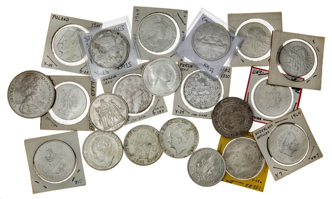 20th Century World Silver Crowns. Lot. Includes: Straits Settlements, Dollar 1903, Iran, 5 Kran AH 1320 (2); Hungary, Proof restrike 1909 5 Korona, 1938 St. Stephen 5 Pengo; Poland, 10 Zlotych 1932, 1933 (2), 1935-Pilsudski; issues of the Bahamas, Bermuda (4), Canada (2), Ceylon, Curacao (2), France (2), Latvia, Mexico (2), Netherlands Antilles, Netherlands East Indies (2), South Africa. VF-BU. (28)