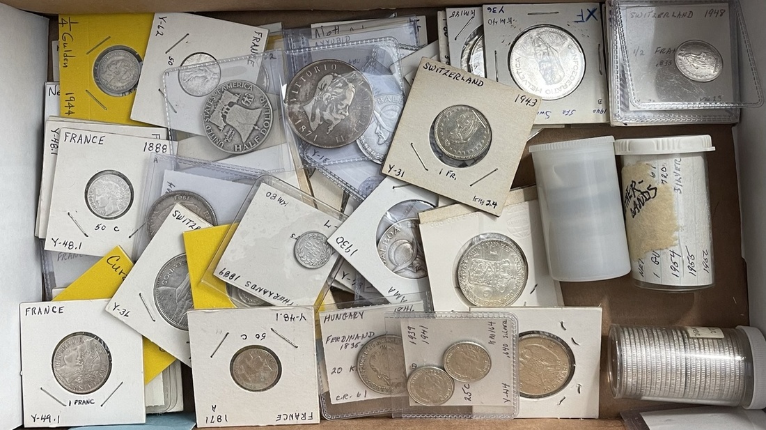 World and U.S. Silver Coins. World (116), nearly all 19th-20th Century, mostly Europe, ca. Dime-Half Dollar size; U.S. Washington Quarters (25) and a Franklin Half. VG-Uncirculated.