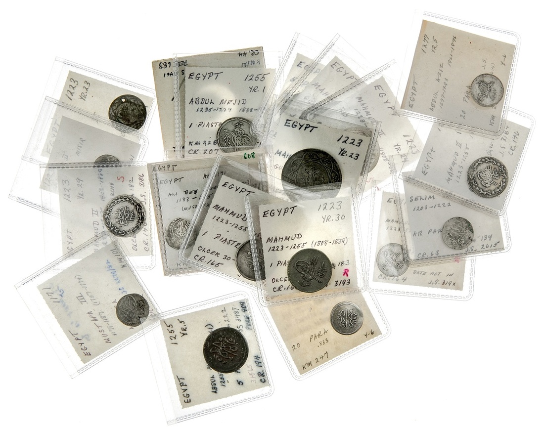 Egypt. Ottoman. Mahmud II (AH 1223-1255/ 1808-1839 AD). Group of minors. 20 Para, acs AH 1223, years 23, 24 (pressmark), 30; 'Irsh, years 23 (2), 28, 29, 30, 32; and holed 10 Para year 23, Akce, and 5 Para year 31. Fine-VF; also Para, AH 1168 (holed), 1171, `Ali Bey (AH 1171), 1187 year 2, 1203 year 2; and `Abd al-Mejid. 'Irsh year 1 and 5 Para year 5. VG-VF. (19)