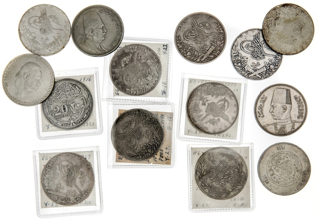 Egypt. Ottoman-Kingdom. Lot of 20 'Irsh. `Abd al-Hamid II: Acs. AH 1293, years 10, 16, 20, 21, 22; 29, 30, 31, 32 and 33H; and 27 and 29 W; Acs. AH 1327, years 2, 3 (small dig/gouge), 4 and 6H. KM 296, 310; British Protectorate, Husein Kamil. AH 1335-1916, AH 1335-1917. Generally Fine-VF; the 1293/27 W and 29 W, About EF-EF, the 1335-1917 About EF; Malik Fuad. AH 1341-1923 (2), 1348-1929 BP, AH 1352-1933; Malik Farouk. AH 1356-1937, 1358-1939. KM 321, 338, 352, 368. About VF-EF; also UAR. Gi'ney, (1970). KM 425. Uncirculated. (25)