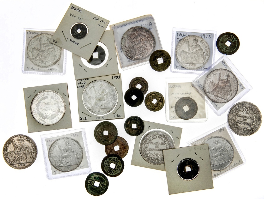 French Indo China. Group of Piastres (23): 1896, 1898, 1901, 1902, 1903 (3), 1904, 1905 (2), 1906, 1907, 1908 (2), 1909, 1910 (once lightly polished, now toned some tiny obv. digs, VF), 1913 A, 1921, 1922 H, 1924, 1925, 1926 and 1927 A. KM 5a.1, 5a.3. Some wiped or cleaned in the past. Generally VF-EF; also 10 Cents, 20 Cents (8), 1947 Piastre, 2 Sapeque 1888 A; and Annam. AEs (38), 1300s-1945. VG-VF. (72)