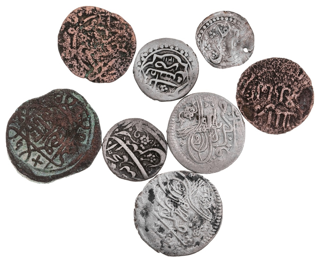 Georgia. Queen Rusudan-time of Erekle II. Lot. AEs of Rusudan, Dimitri II, Jalal al-Din (corrosion). VG-Fine; Ottoman occupation. Abbasi, Tiflis AH 1115 (2). Fine with some deposits, corrosion and About VF; Anonymous Abazi, AH 1194, 1211. VF; and ½ Abazi, AH (119)9. Holed and crinkly. (8)