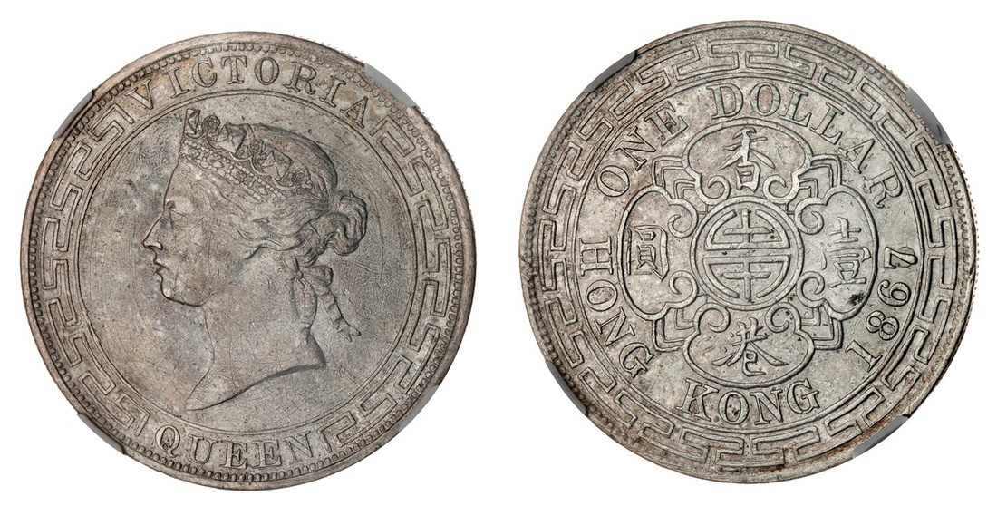 Hong Kong. Victoria (1842-1901). Dollar, 1867/6. Crowned head left, classical border, rev. Chinese, in fancy cartouche, and English (around) legends, classical border. KM 10. NGC AU Details, tooled.