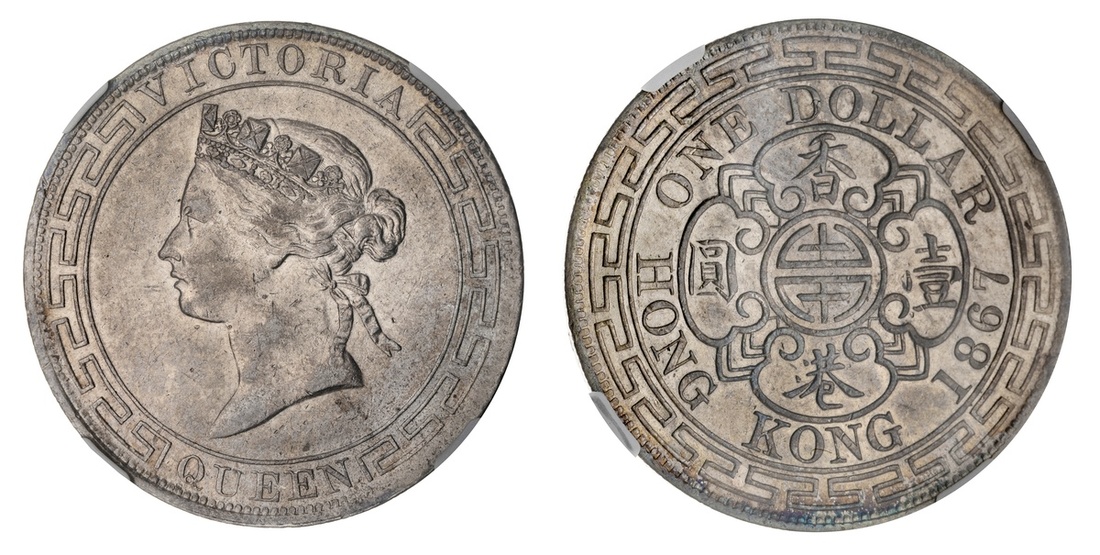 Hong Kong. Victoria (1842-1901). Dollar, 1867. Crowned head left, classical border, rev. Chinese, in fancy cartouche, and English (around) legends, classical border. KM 10. NGC AU 53. Pearly lustre.
