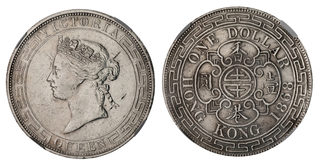 Hong Kong. Victoria (1842-1901). Dollar, 1868. Crowned head left, classical border, rev. Chinese, in fancy cartouche, and English (around) legends, classical border. KM 10. NGC AU Details, harshly cleaned. Now lightly toning.