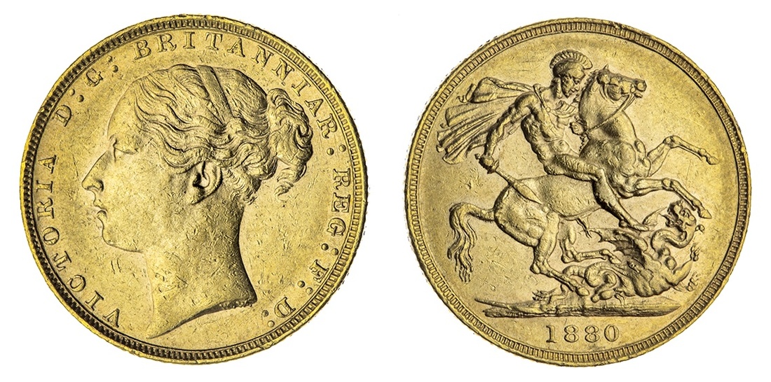 Victoria (1837-1901), 'St George and Dragon', Sovereign, 1880, London, young head left, plain truncation, rev. St. George and Dragon, horse with short tail, no BP in exergue, edge milled, 7.98g*, 7h (Marsh 91C; Spink 3856C), bagmarked but lustrous, about extremely fine