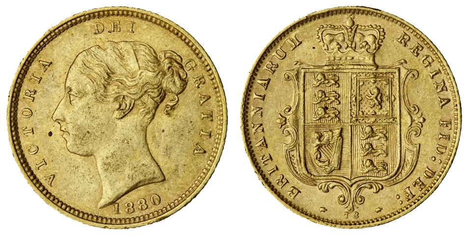 Victoria (1837-1901), Half-Sovereign, 1880 [Die 78], Type A5, young head left, truncation plain, rev. crowned and garnished shield, edge milled, 3.99g, 7h (Marsh 455A; Spink 3860F), of brighter appearance, nevertheless lustrous, a really good very fine