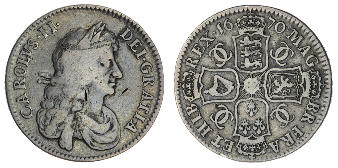 Charles II (1660-1685), Halfcrowns (2), 1670 VICESIMO SECVNDO, third laureate and draped bust right, rev. crowned shields cruciform, eight strings to harp, lettered edge downwards, 14.56g, 6h (ESC 467; Bull 453; Spink 3365), contact marked, including two dig marks to obverse, otherwise lightly toned, fine; another, 1677 VICESIMO NONO, fourth bust, similar, six strings to harp, lettered edge downwards, 14.51g, 7h (ESC 479; Bull 480; Spink 3367), scratched and with some pitted marks to uneven surfaces, otherwise toned, very fine (2)