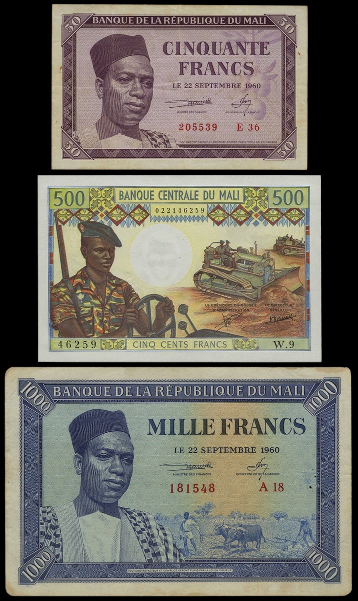 Mali. Banque de la République du Mali. Trio. 50 Francs. 1960. P-1. President Keita at left. EF; 1000 Francs. 1960. P-4. Pinhole, edge rounding. VF; and 500 Francs. P-12c. Soldier, tractors. Unc. [3]