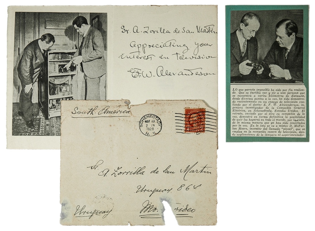 B>Alexanderson, Ernest Frederick Werner (1878-1975). Swedish-American electrical engineer, radio and television pioneer, and Father of the Television. Autograph Note Signed "E.T.W. Alexanderson". 8 1/3 x 5 ¾" folding card, Alexanderson writes on the right side "Sr. A. Zorilla de San Martin Appreciating your interest in television" and signs below. The left side of the note card is a B&W image of Alexanderson showing the back of an early television to a visitor (the first television broadcast in the U.S. was received at Alexanderson's GE plot home in Schenectady, NY in 1927). Accompanied by the front of the original envelope in which the note was sent, postmarked "Schenectady May 10 1928" and addressed to Sr. Zorilla de San Martin in Montevideo, Uruguay; and a period Spanish newsclipping showing Alexanderson. Some paper adhesion to blank back of note. Very Good and rare.