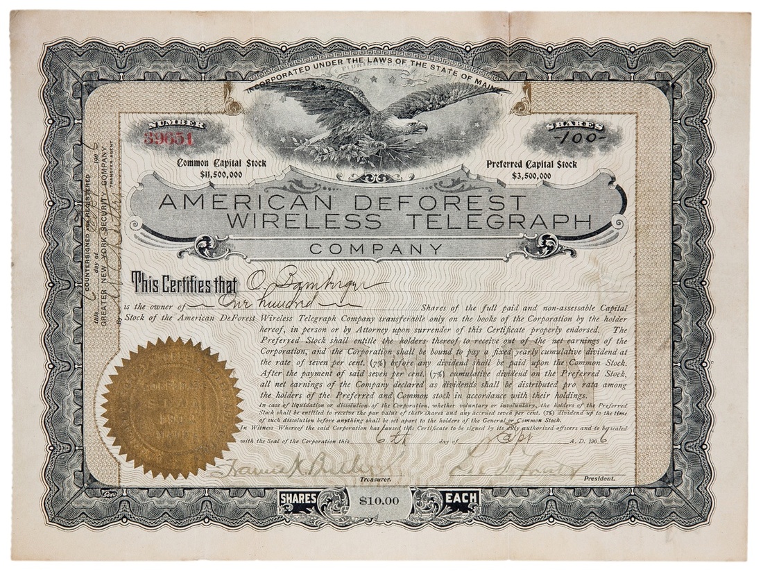 de Forest, Lee (1873-1961). American inventor and early pioneer in radio and in the development of sound-on-film recording used in motion pictures, inventor of the Audion vacuum tube, the first practical amplification device -- a foundation for the field of electronics. Document Signed "Lee de Forest". American DeForest Wireless Telegraph Company (ME) stock certificate for 100 shares signed below in pale brown by de Forest as President, Sept. 6, 1906. Number 39651 issued to an O. Bamberger. American eagle vignette, black borders, brown frame. Light stain, soiling at fold creases, small split top edge at fold line. Fine-About VF. Ex Spink-Smythe Sale 280, June 18, 2008, lot 74.