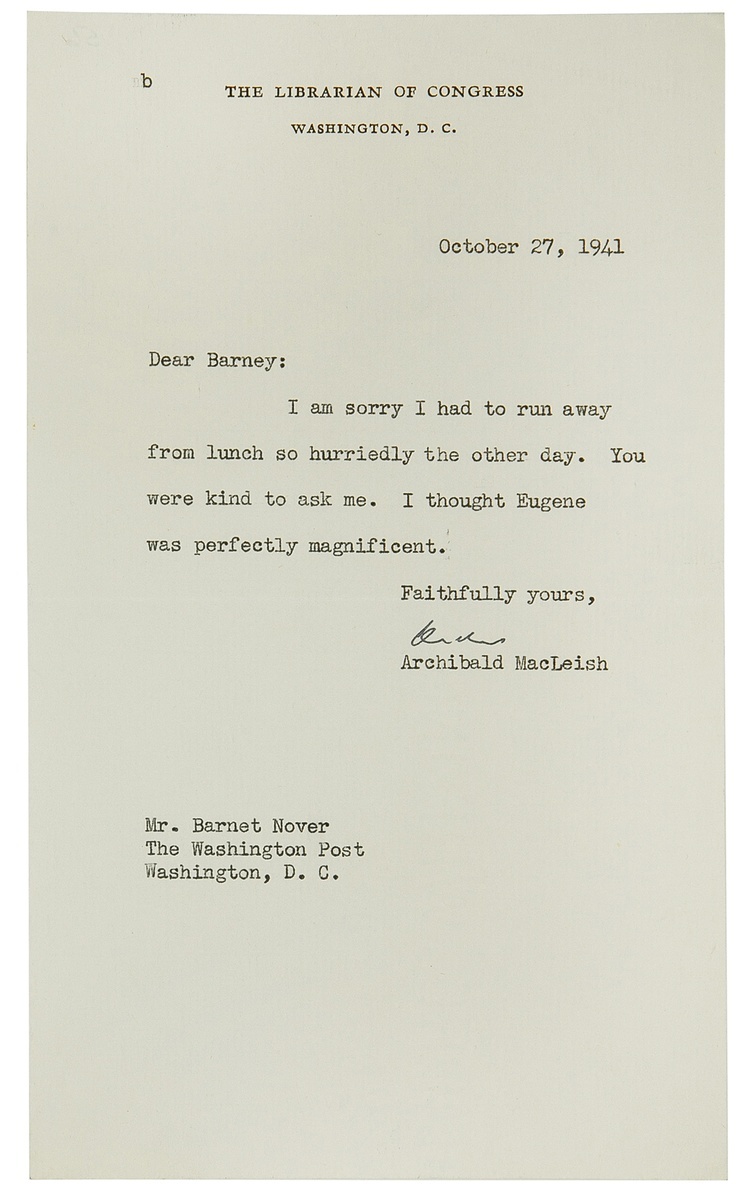 MacLeish, Archibald (1892-1982). American modernist poet and writer, 9th Librarian of Congress (1939-1944). Typed Letter Signed as Librarian of Congress. On official letterhead, 5 x 8 ½", October 27, 1941. MacLeish apologizes to Barney Nover of The Washington Post for having to "run away from lunch so hurriedly…" Very Fine.