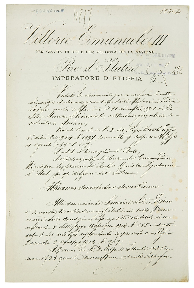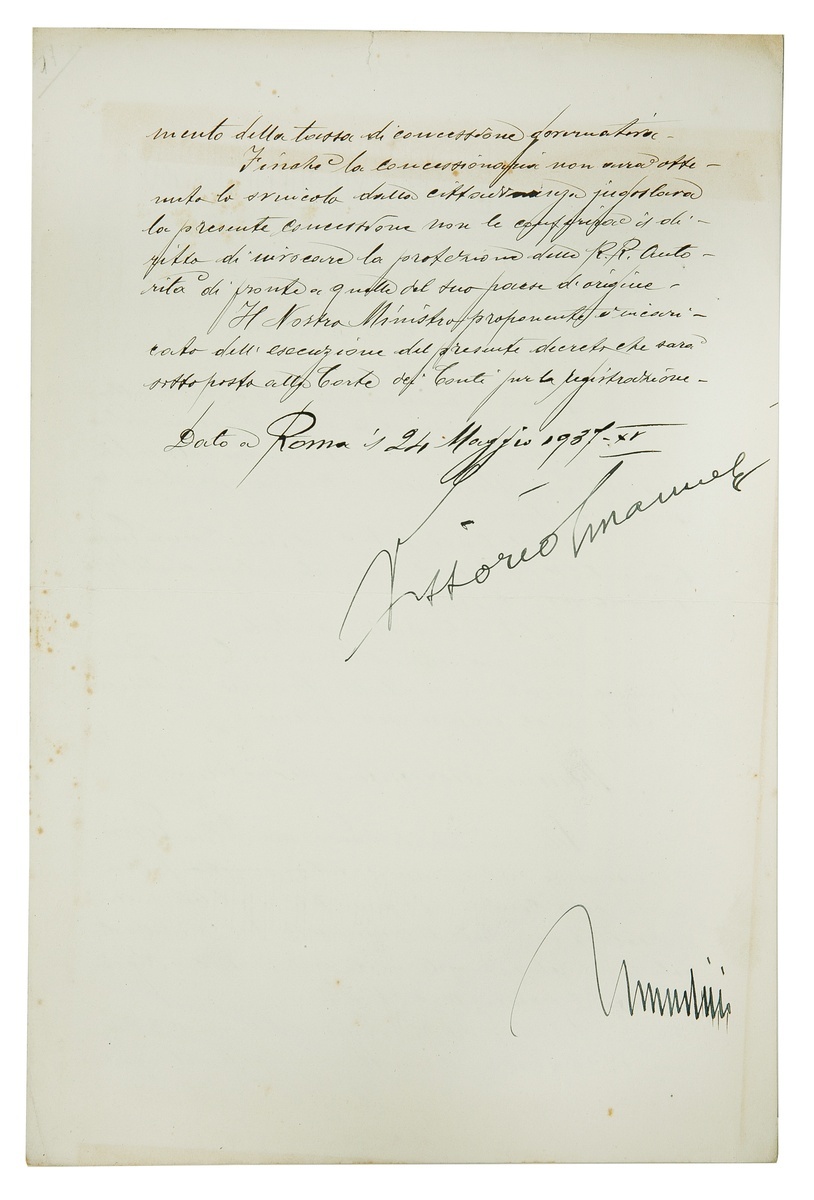 Benito Mussolini and Vittorio Emanuele III. Il Duce, Prime Minister (1922-1943) and Dictator of Italy; a principal founder of fascism. After the assassination of his father, Umberto, Vittorio Emanuele III reigned as last king of Italy from 1900 to his abdication in-1946. Document Signed. Folio, 1 ½ pages, official letterhead, "Vittorio Emanuele III…Re d'Italia Imperatore d'Etiopia," 24 May 1937. Signed by both men in black at end. Light staining in margins, some pinholes; small edge split at top. Very Good.
