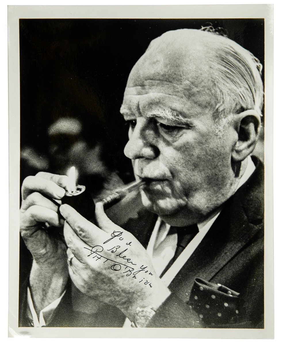 O'Brien, William Joseph Patrick "Pat" (1899-1983). Irish-American and one of the best known screen actors from the 1930s and 1940s; especially remembered for his roles in Knute Rockne, All American, Angels with Dirty Faces and Some Like it Hot. Photo Signed "God Bless you Pat O'Brien". 8 x 10" B&W photo of an older O'Brien lighting a pipe, he signs in black on his hand. Very Fine.