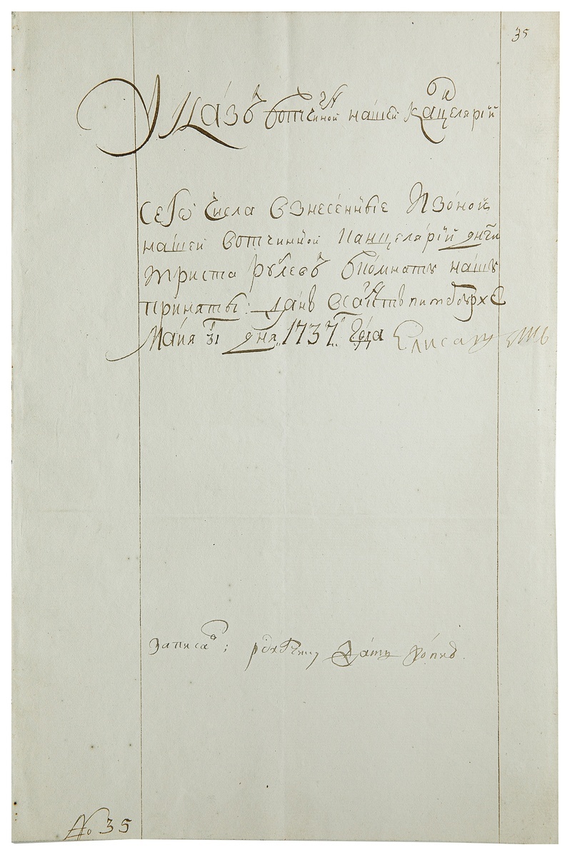 [Russian Imperial]: Elizabeth Petrovna. Empress of Russia, 1741-1762. One of Russia's most popular monarchs, second eldest daughter of Peter the Great, continued her father's policies bringing about an Age of Enlightenment in Russia; modernized Russia's roads, encouraged the foundation of the University of Moscow and Imperial Academy of Arts, financed grandiose baroque projects; led Russia during the two major European conflicts of the time - the War of the Austrian Succession and the Seven Years War. Document Signed "Elizabeth during the reign of her sister Anna. One-page, handwritten decree from the Chancellery in Russian, 8 x 12 ¼", May 31, 1737: "On this date, three hundred Rubles were submitted to the office and accepted." Elizabeth signs to the right of the date below. Very Fine.