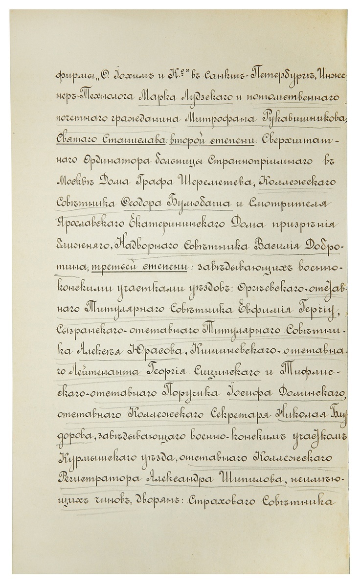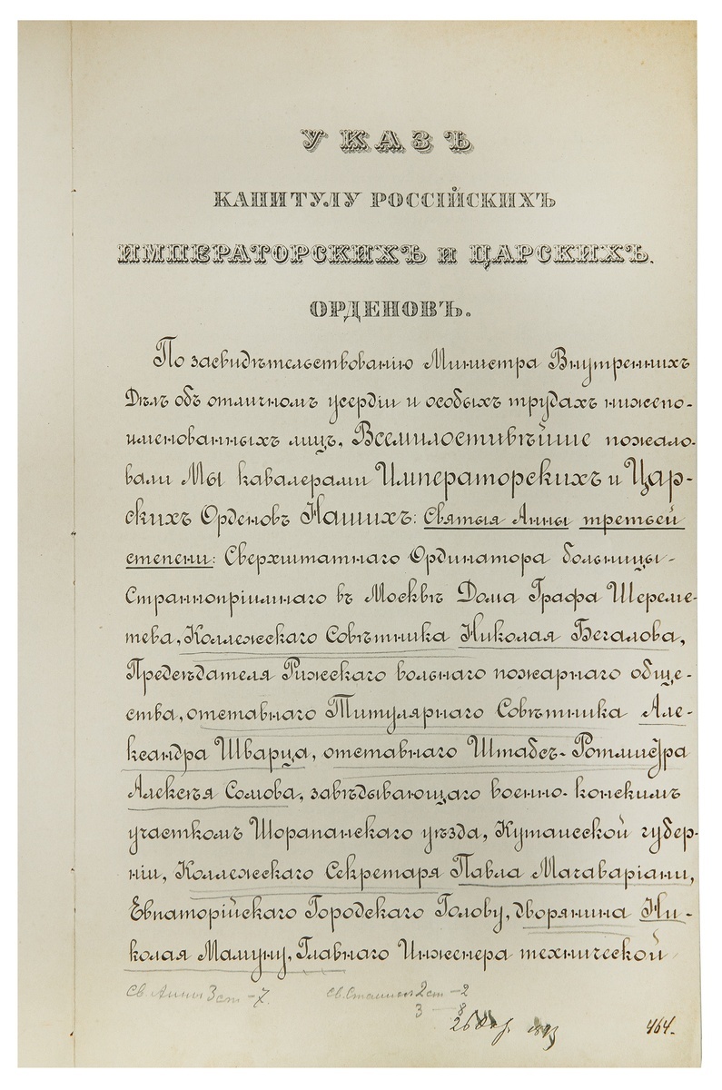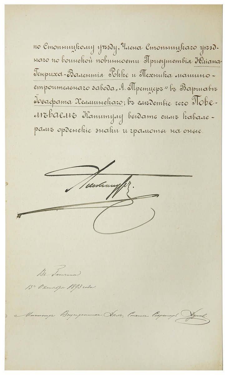 [Russian Imperial]: Alexander III, Emperor of Russia, 1881-1894. Reactionary son of Alexander II, reversed some of his father's liberal reforms, known as the "Peacemaker" as Russia fought no major wars during his reign. Document Signed "Alexander" as emperor. Two and one half pages, partially printed Decree in Russian, 8 x 13 ½", Oct. 13, 1893. The Decree grants various Government and Medical personal Imperial Orders. The Emperor signs below on the last page boldly and with flourish. Very Fine.