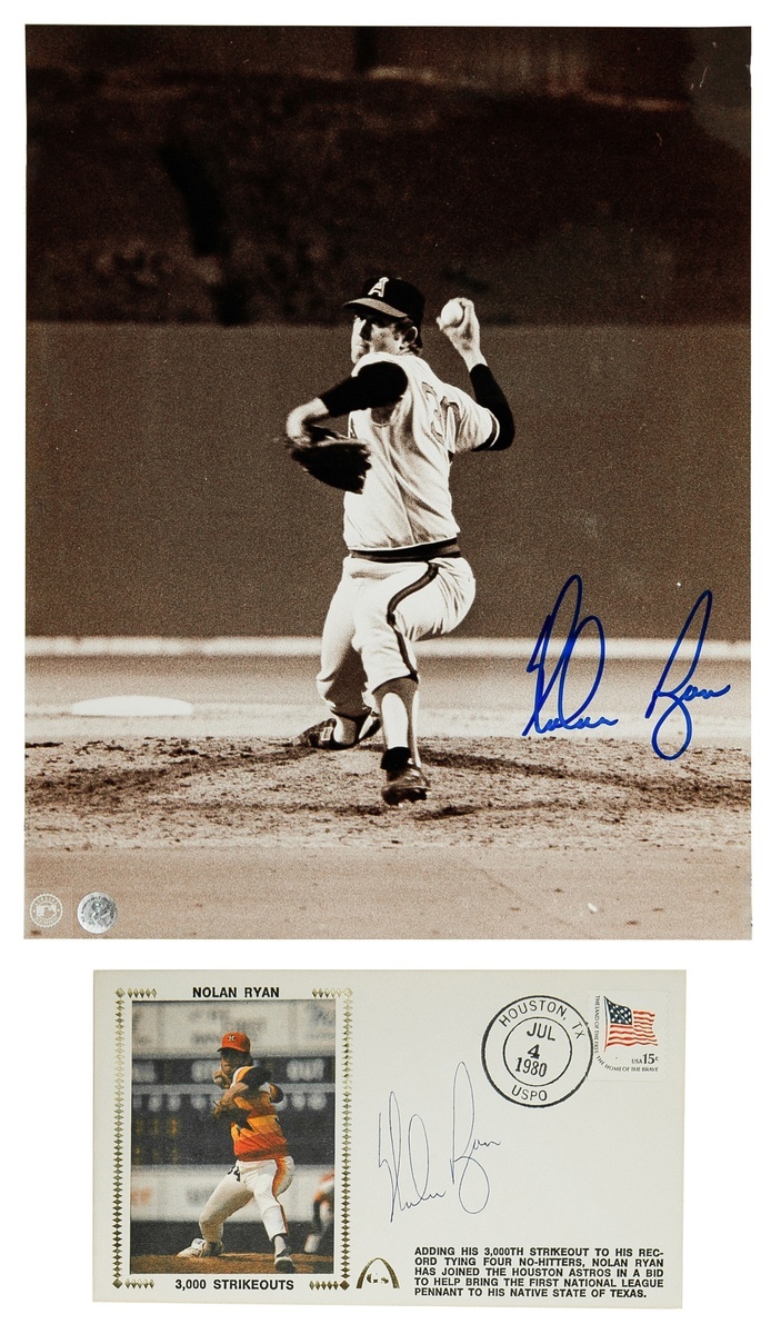 Ryan, Nolan. Major League Baseball Hall-of-Fame pitcher; over a record 27-year career pitched for the New York Mets, California Angels, Houston Astros, and the Texas Rangers. Pair: Photo Signed, and Cachet Cover signed. 8 x 10" B&W photo of Ryan reaching back to pitch from the stretch, signed lower right in blue marker. "Nolan Ryan 3,000 Strikeouts" cachet cover, franked "Houston TX July 4 1980", signed in blue pen. Both with CoAs from All American Collectibles, Fair Lawn NJ. Very Fine. [2]