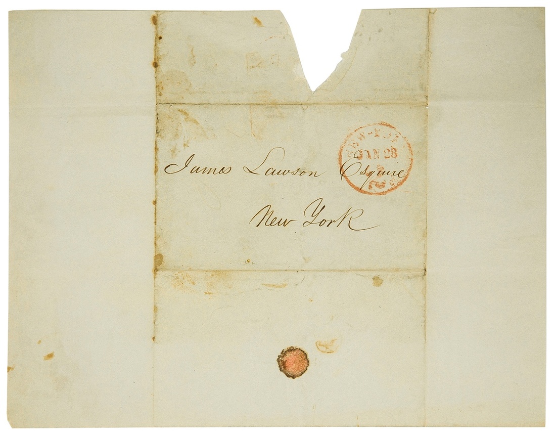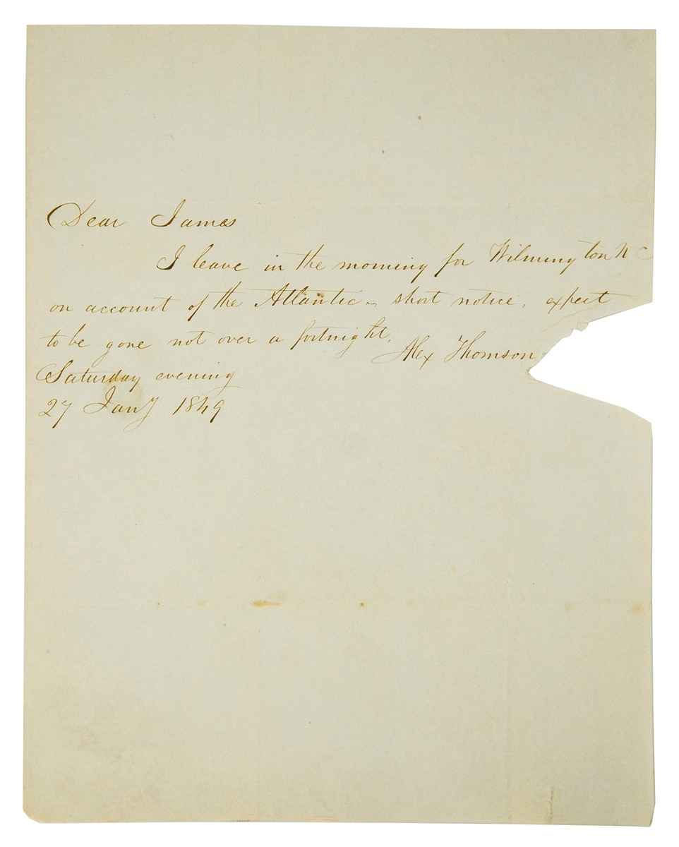 Thomson, Alexander "Greek" (1817-1875). Eminent Glaswegian architect; architectural theorist and pioneer in the field of sustainable building; starting mid-20th Century, his critical reputation began being revived, some in conjunction with his likely influence on Frank Lloyd Wright. Autograph Letter Signed "Alex Thomson". One page, 8 x 10", dated January 27, 1849. Thomson writes to fellow architect James Lawson: "I leave in the morning for Wilmington NC on account of the Atlantic on short notice, expect to be gone not over a fortnight". He signs and dates the letter below. With integral address leaf, franked "New York Jan 28". Seal tear from opening nearly touches final letter in "Thomson", otherwise Very Good. Very rare.