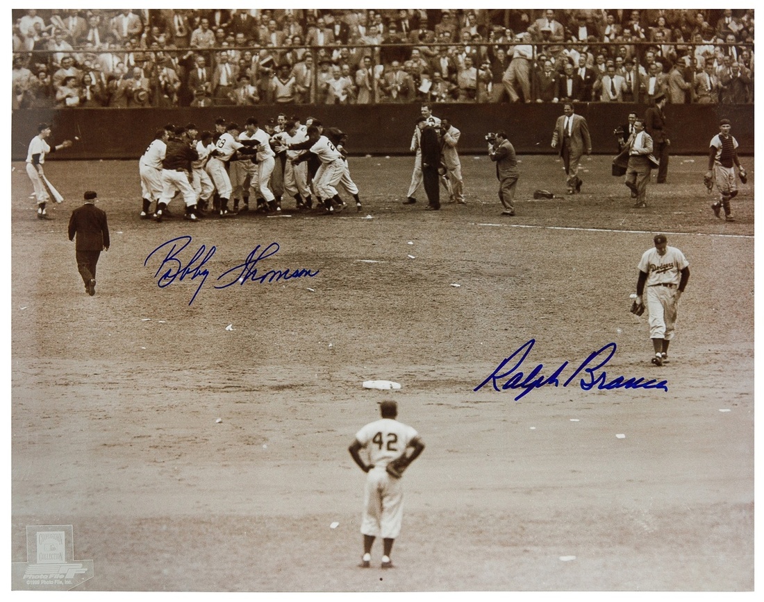 [Baseball]. Ralph Branca and Bobby Thomson - "The Shot Heard Around the World". Photo Signed "Bobby Thomson" and "Ralph Branca". 14 x 10 7/8" sepia photo of the NY Giants congratulating Bobby Thomson after his three-run homer off of Brooklyn Dodger pitcher Ralph Branca in the 9th inning of the decisive third game of the playoffs on October 3, 1951 to give the Giants the National League pennant; a dejected Branca walks away from the mound. Thomson and Branca sign in blue marker near their respective image. With CoA from All American Collectibles, Fair Lawn, NJ. Very Fine.